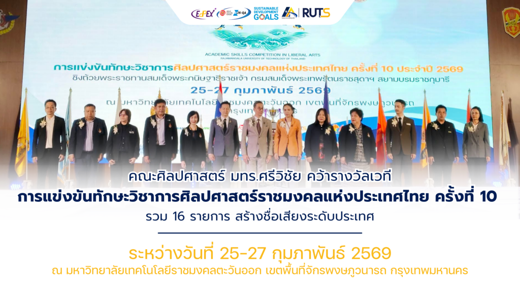 คณะศิลปศาสตร์ มหาวิทยาลัยเทคโนโลยีราชมงคลศรีวิชัย นำโดย ผู้ช่วยศาสตราจารย์ ดร.บุญฤทธิ์ โอมณี พร้อมด้วยคณาจารย์และนักศึกษา เข้าร่วมการแข่งขันทักษะวิชาการศิลปศาสตร์ราชมงคลแห่งประเทศไทย ครั้งที่ 10 ประจำปี 2569 ชิงถ้วยพระราชทานสมเด็จพระกนิษฐาธิราชเจ้า กรมสมเด็จพระเทพรัตนราชสุดาฯ สยามบรมราชกุมารี ระหว่างวันที่ 25–27 กุมภาพันธ์ 2569 ณ มหาวิทยาลัยเทคโนโลยีราชมงคลตะวันออก เขตพื้นที่จักรพงษภูวนารถ กรุงเทพมหานคร
