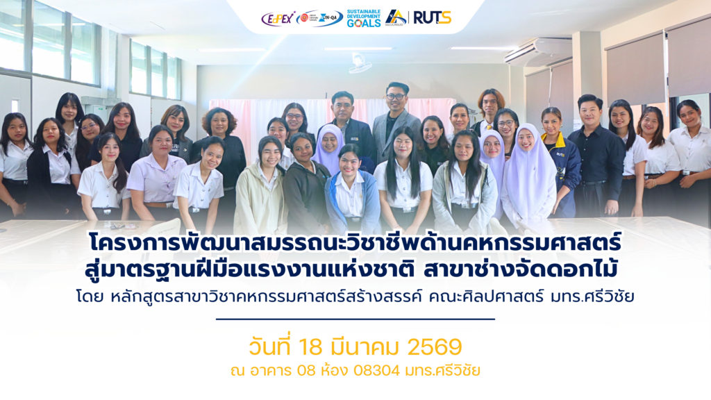 หลักสูตรสาขาวิชาคหกรรมศาสตร์สร้างสรรค์ คณะศิลปศาสตร์ มทร.ศรีวิชัย จัดโครงการพัฒนาสมรรถนะวิชาชีพด้านคหกรรมศาสตร์สู่มาตรฐานฝีมือแงงานแห่งชาติ สาขาช่างจัดดอกไม้ ณ อาคาร 08 ห้อง 08304 มทร.ศรีวิชัย